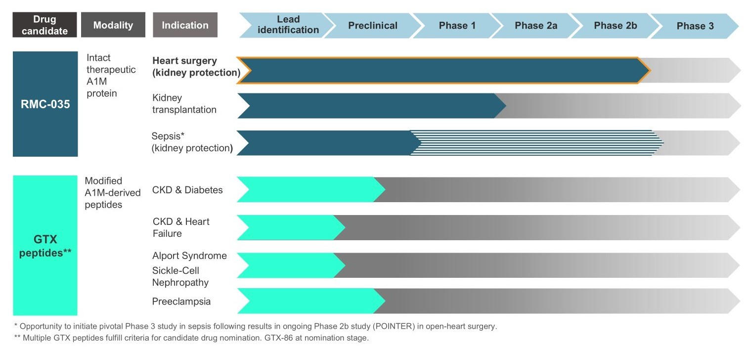 RMC-035 utvärderas inom två separata program, dels som njurskyddande behandling vid öppen hjärtkirurgi, dels vid njurtransplantation. Sepsis är ytterligare en potentiell målgrupp för behandling med RMC-035, baserat på det stora medicinska behovet och de lovande behandlingseffekterna som observerats i prekliniska studier.